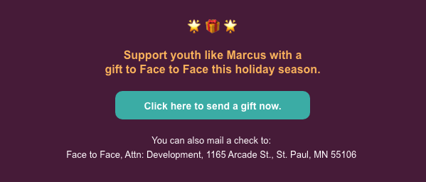 Thank you for supporting Face to Face and for making sure that the staff and programs are available to me and other young people.