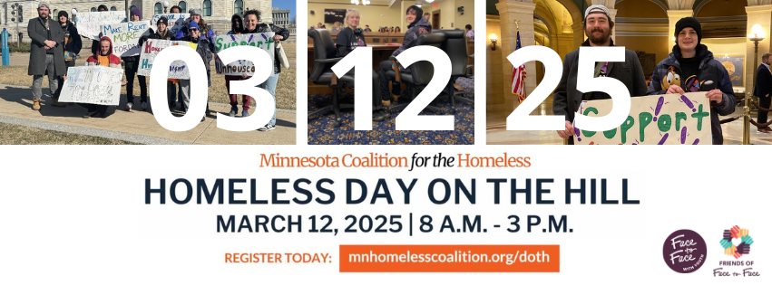 - Attend Minnesota Coalition for the Homeless’s (MCH) event with Face to Face Friends, staff, and youth. We’ll meet at SafeZone (8 a.m.), walk to the MCH breakfast gathering and program (9 a.m.), then travel to the Capitol (10 a.m.) for meetings with lawmakers, followed by lunch. Join us for all or part of the day! Register here now.
