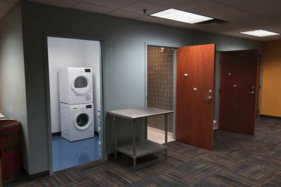 The laundry and shower facilities are great for getting ready for work and job interviews.